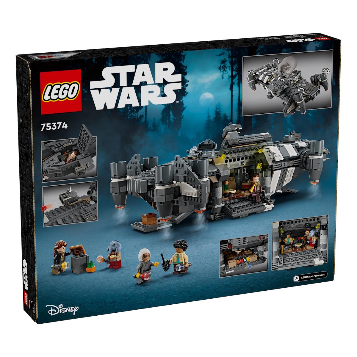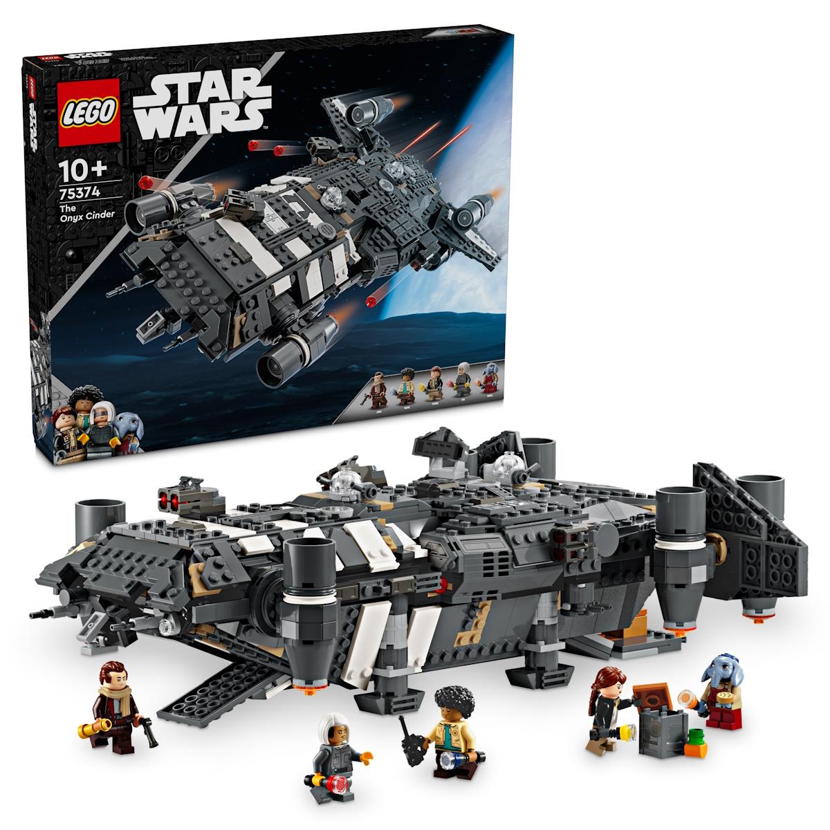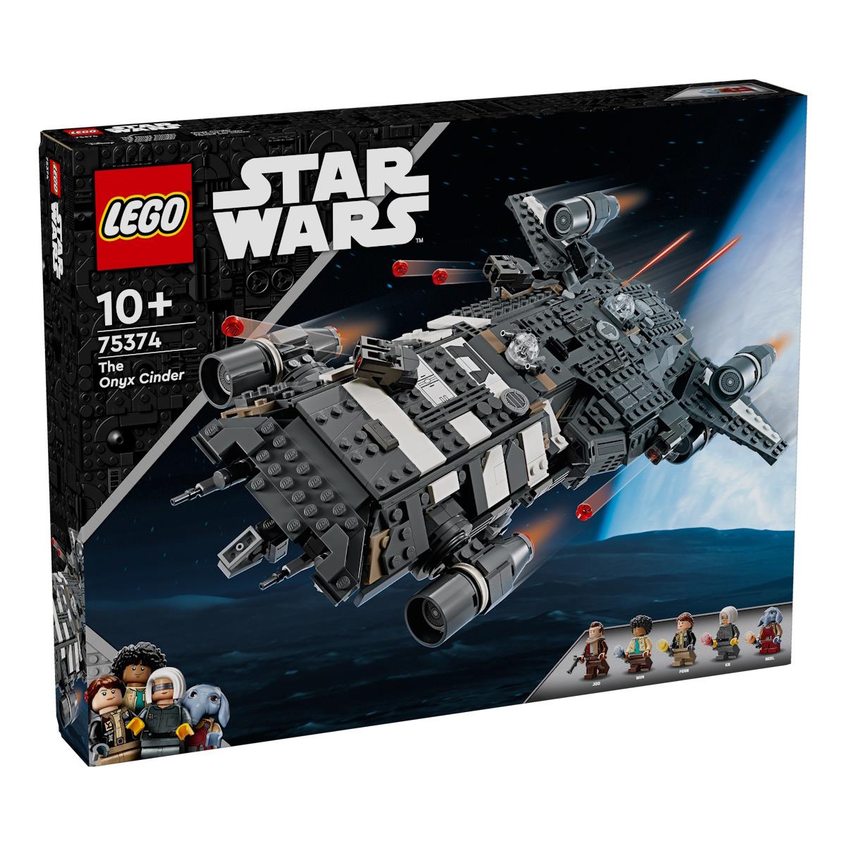 As crianças tornam-se nos heróis das suas histórias de Star Wars: Skeleton Crew com uma recriação detalhada com peças LEGO® da Onyx Cinder (75374). Esta nave espacial colecionável LEGO Star Wars™ para construir inclui motores rotativos para a aterragem/descolagem ou voo, 2 disparadores de espigas, 2 torreões rotativos, cada um com 2 disparadores de espigas e uma garra para agarrar. Inclui lugares para todas as 5 personagens LEGO Star Wars incluídas (Jod, a minifigura LEGO no cockpit e Wim, Fern, KB e Neel no compartimento de passageiros), além de arrumação para 4 lanternas e outras mercadorias. Existe ainda uma mesa de cozinha e uma cama, além dos elementos acessórios, tais como fruta e um walkie-talkie para inspirar brincadeiras criativas.