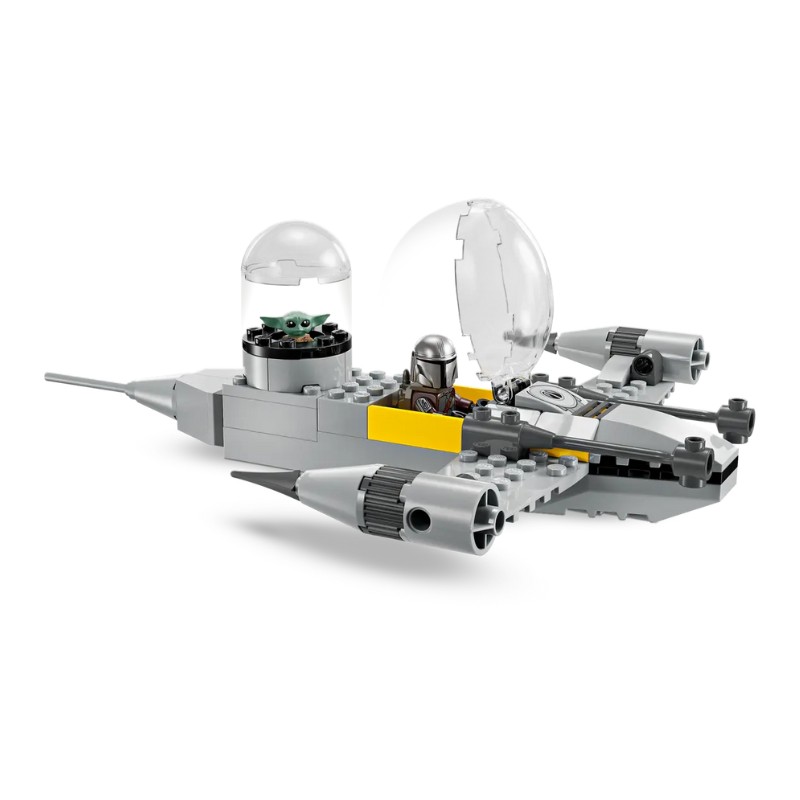 Este kit de construção da maqueta do caza estelar N-1 inclui 3 personagens LEGO Star Wars: o Mandaloriano (com a sua Espada Escura e uma mochila propulsora), Grogu (com a sua aerocuna) e R5-D4. Abre a cabina para colocar o Mandaloriano no caza estelar N-1 e o Grogu no espaço para passageiros.
