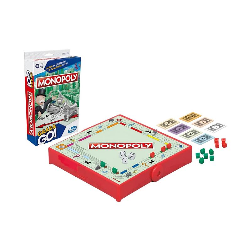 O jogo Monopoly Grab and Go é uma versão compacta do jogo Monopoly que traz às mesas regras do jogo original num formato de bolso. Como no Monopoly original, os jogadores compram, vendem e sonham em ficarem ricos e vencerem a partida.