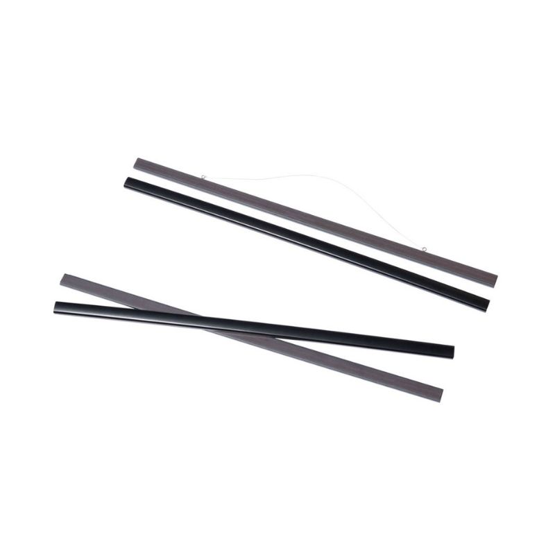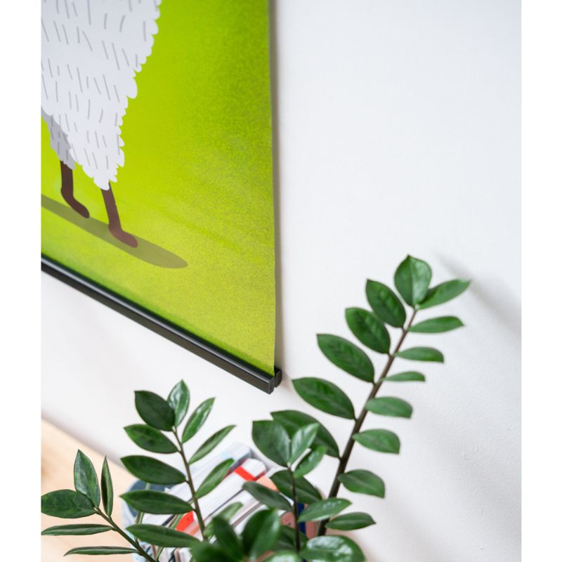 Suporte Magnético para Poster Vertical. Possui um sistema de duas peças, uma na parte superior e outra na parte inferior, ambas com ímans para prender o poster. Feito em madeira.